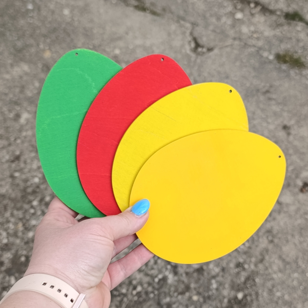 Vajíčka z překližky, natřená a připravená na tečkování. Každé vajíčko je natřené z obou dvou stran. Po prvním nátěru zabroušeno, pak druhý nátěr: podklady jsou krásně hladké.